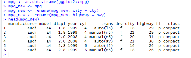 #패키지 설치 및 로드 install.packages("dplyr") library(dplyr) #mpg 데이터 복사 mpg <- as.data.frame(ggplot2::mpg) mpg_new <- mpg #변수명 변경 mpg_new <- rename(mpg_new, city = cty) mpg_new <- rename(mpg_new, highway = hwy) #데이터 앞부분 출력 head(mpg_new)