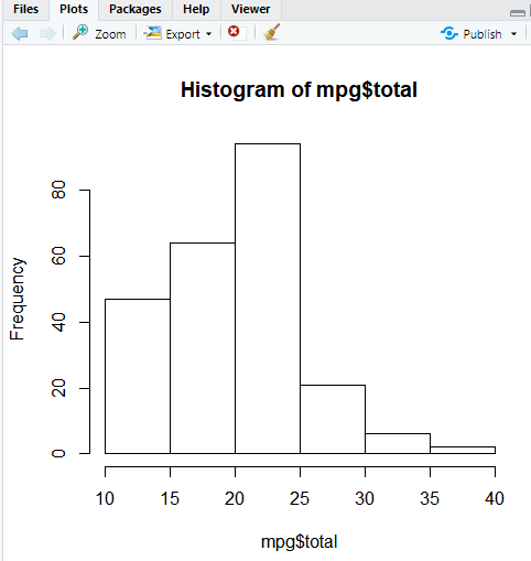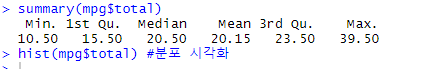 mpg$total <- (mpg$cty + mpg$hwy)/2 head(mpg) mean(mpg$total)