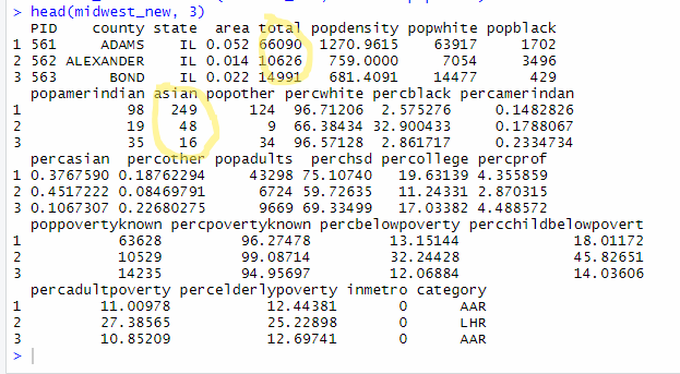 library(dplyr) midwest_new <- midwest midwest_new <- rename(midwest_new, total = poptotal) midwest_new <- rename(midwest_new, asian = popasian) head(midwest_new, 3)