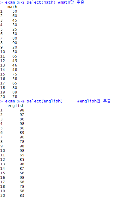 #class가 1인 행 추출 한 다음, english 점수만 추출 exam %>% filter(class ==1) %>% select(english) #가독성 있게 줄 바꾸기 exam %>% filter(class ==1) %>% select(english) #일부만 출력하기 (id, math를 앞부분 6행까지만 추출) exam %>% select(id, math) %>% head exam %>% select(id, math) %>% head(10)