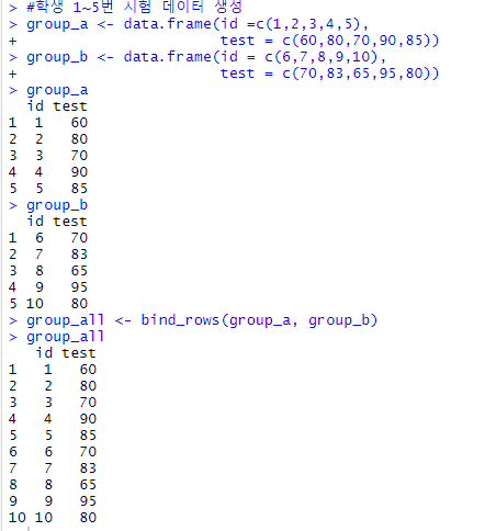 #학생 1~5번 시험 데이터 생성 group_a <- data.frame(id =c(1,2,3,4,5), test = c(60,80,70,90,85)) group_b <- data.frame(id = c(6,7,8,9,10), test = c(70,83,65,95,80)) group_a group_b #a, b 데이터 합쳐서 group_all 에 할당 group_all <- bind_rows(group_a, group_b) group_all