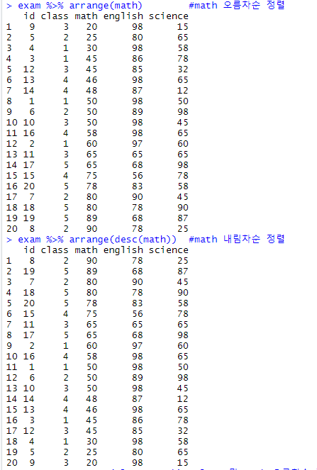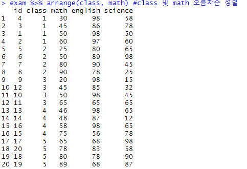 exam %>% arrange(math) #math 오름차순 정렬 exam %>% arrange(desc(math)) #math 내림차순 정렬 exam %>% arrange(class, math) #class 및 math 오름차순 정렬