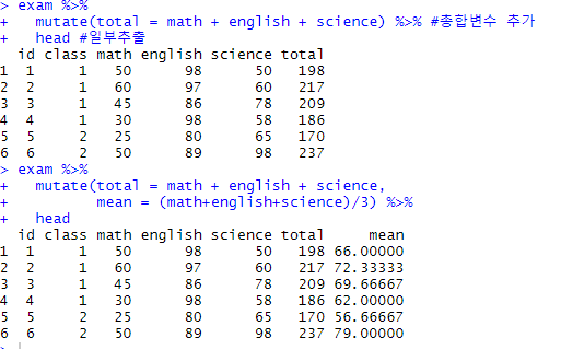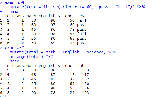 exam %>% mutate(total = math + english + science) %>% #총합변수 추가 head #일부추출 exam %>% mutate(total = math + english + science, mean = (math+english+science)/3) %>% head exam %>% mutate(test = ifelse(science >= 60, "pass", "fail")) %>% head exam %>% mutate(total = math + english + science) %>% arrange(total) %>% head