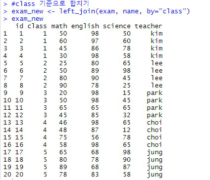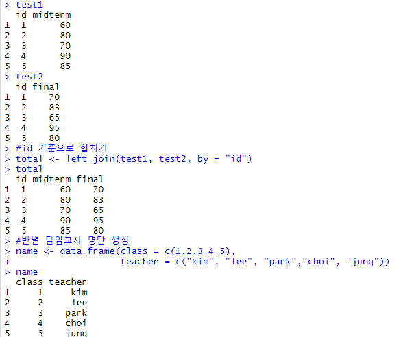 #중간고사 데이터 생성 test1 <- data.frame(id = c(1,2,3,4,5), midterm = c(60,80,70,90,85)) #기말고사 데이터 생성 test2 <- data.frame(id = c(1,2,3,4,5), final = c(70,83,65,95,80)) test1 test2 #id 기준으로 합치기 total <- left_join(test1, test2, by = "id") total #반별 담임교사 명단 생성 name <- data.frame(class = c(1,2,3,4,5), teacher = c("kim", "lee", "park","choi", "jung")) name #class 기준으로 합치기 exam_new <- left_join(exam, name, by="class") exam_new