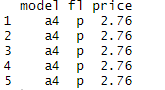 mpg <- left_join(mpg, fuel, by = "fl") mpg %>% select(model, fl, price) %>% head(5)