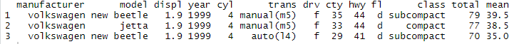 mpg <- as.data.frame(ggplot2::mpg) mpg_copy <- mpg mpg_copy <- mpg_copy %>% mutate(total = cty+hwy) mpg_copy <- mpg_copy %>% mutate(mean = (cty+hwy)/2) mpg_copy %>% arrange(desc(mean)) %>% head(3)