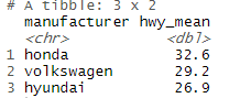 mpg %>% group_by(manufacturer) %>% summarise(hwy_mean =mean(hwy)) %>% arrange(desc(hwy_mean)) %>% head(3)