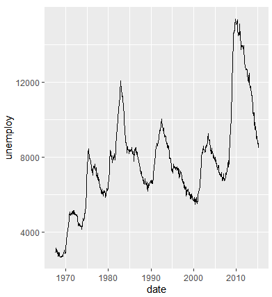 ggplot(data = economics, aex(x = date, y = unemploy)) + geom_line()