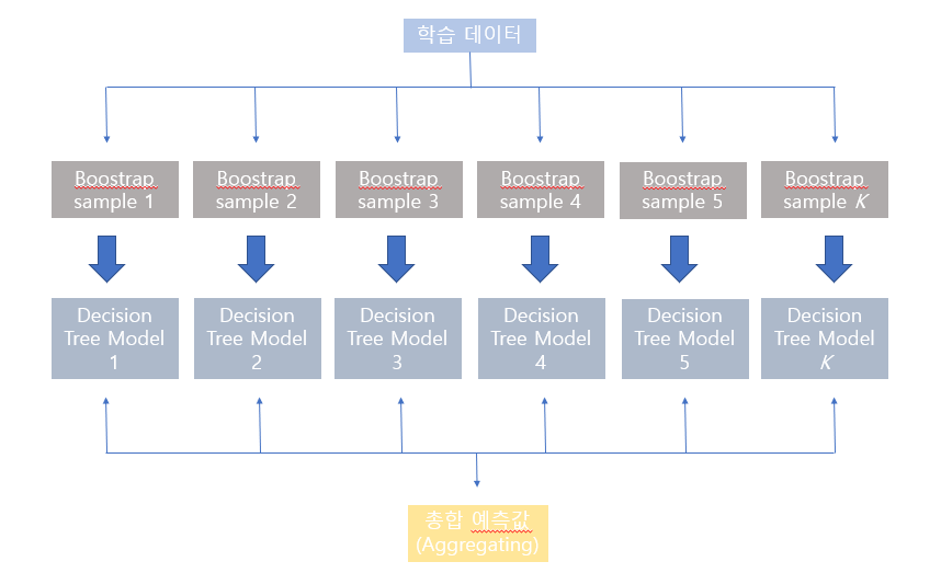 배깅이란, boostrap aggregating의 약어로 데이터를 가방(bag)에 쓸어 담아 복원 추출하여 여러 개의 표본을 만들어 이를 기반으로 각각의 모델을 개발한 후에 결과를 하나로 합쳐 하나의 모델을 만들어 내는 것이다.