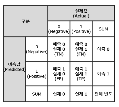 실제값과 예측값의 범주를 기준으로 교차 표(confusion Matrix)를 작성할 수 있다.