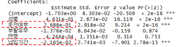 - 오즈비의 해석: estimate 값이 로그를 통한 값이기 때문에 exp를 취해야 함