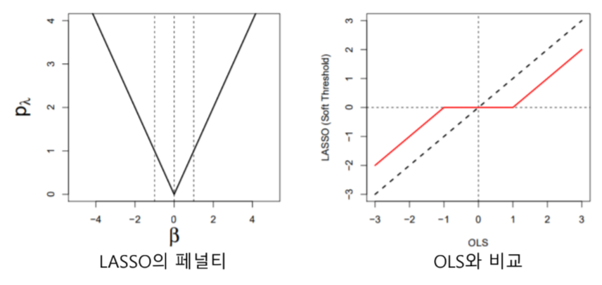 회귀분석의 최소제곱 추정(OLS)와 함께, 변수의 영향력이 t 보다 작으면 0으로 끌어내어 패널티를 준다.