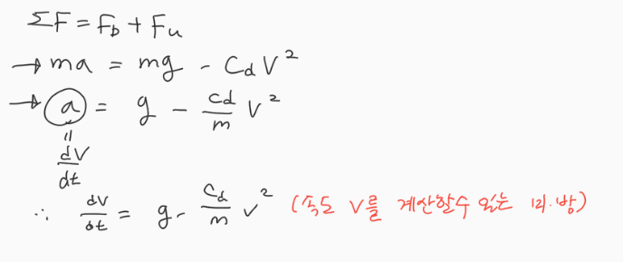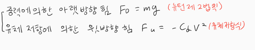 즉, 힘의 총합은 Fd와 Fu 두가지를 더한 것이다. 이 힘을 이용해 F = ma라는 식을 가지고