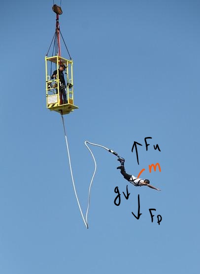 [참고] https://pixabay.com/photos/bungee-fall-jump-fun-sport-rope-4453636/ 이때 떨어지는 사람에 대해 작용하는 힘은 위 그림에서 보듯 두가지 힘이 존재하는데,
