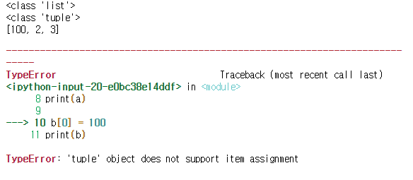 a = [1, 2, 3] b = (1, 2, 3) print(type(a)) print(type(b)) a[0] = 100 print(a) b[0] = 100 #error print(b)