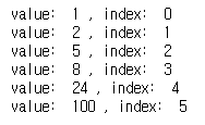 - enumerate 함수를 이용해 인덱스와 값 모두 사용 가능