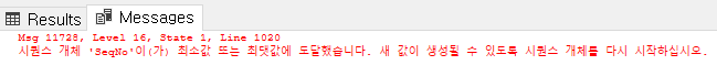 ALTER SEQUENCE dbo.SeqNo MAXVALUE 150 -- MAX 값 초과할 때 까지 수행 SELECT NEXT VALUE FOR dbo.SeqNo;150을 넘어가면 다음과 같은 에러가 발생한다.