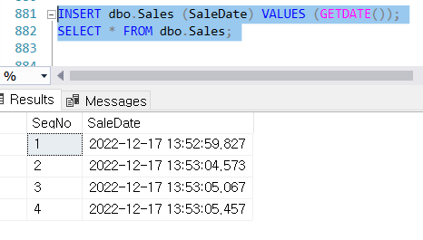 -- INSERT 시 INSERT dbo.Sales (SeqNo, SaleDate) VALUES (NEXT VALUE FOR dbo.SeqNo, GETDATE()) , (NEXT VALUE FOR dbo.SeqNo, GETDATE()) , (NEXT VALUE FOR dbo.SeqNo, GETDATE()) SELECT * FROM dbo.Sales;4+ 3 = > 총 7개의 순번이 생성된다.