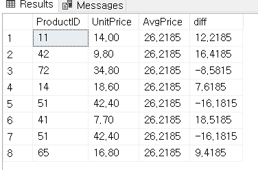 -- Cross Join의 활용: 평균가 대비 단가별 편차 SELECT ProductID , UnitPrice /* 아래 두 가지 열 값을 생성 */ , av.AvgPrice , av.AvgPrice - UnitPrice as 'diff' FROM dbo.[Order Details] As od CROSS JOIN (SELECT AvgPrice = AVG(UnitPrice) FROM dbo.[Order Details] AS od) AS av WHERE OrderID <= 10250;