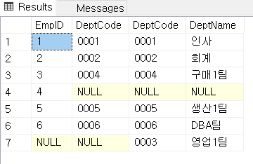 -- 예제 테이블 생성 CREATE TABLE dbo.Depts ( DeptCode char(4) PRIMARY KEY , DeptName varchar(20) ); CREATE TABLE dbo.Emps ( EmpID int PRIMARY KEY , DeptCode char(4) ); INSERT Depts VALUES ('0001', '인사') , ('0002', '회계') , ('0003', '영업1팀') , ('0004', '구매1팀') , ('0005', '생산1팀') , ('0006', 'DBA팀'); INSERT Emps VALUES (1, '0001') , (2, '0002') , (3, '0004') , (4, NULL) , (5, '0005') , (6, '0006'); -- 차집합 SELECT * FROM dbo.Depts AS d WHERE NOT EXISTS (SELECT 1 FROM dbo.Emps AS e WHERE e.DeptCode = d.DeptCode); SELECT * FROM dbo.Emps AS e WHERE NOT EXISTS (SELECT 1 FROM dbo.Depts AS d WHERE e.DeptCode = d.DeptCode); -- 교집합 SELECT * FROM dbo.Emps AS e INNER JOIN dbo.Depts AS d ON e.DeptCode = d.DeptCode; -- Full Outer Join SELECT * FROM dbo.Emps AS e FULL JOIN dbo.Depts AS d ON e.DeptCode = d.DeptCode;