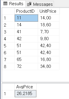 -- 현재 데이터 SELECT ProductID , UnitPrice FROM dbo.[Order Details] As od WHERE OrderID <= 10250 order by 1; SELECT AvgPrice = AVG(UnitPrice) FROM dbo.[Order Details] AS od;