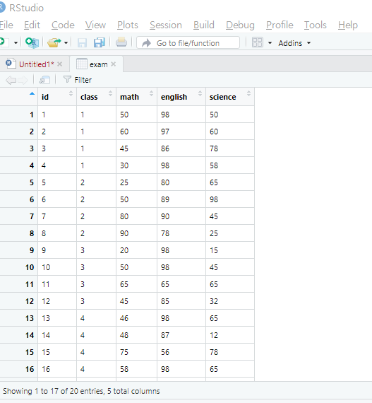 다음으로 View(exam) 이라는 함수를 실행해 보면, view 창에서 exam 이라는 csv 파일 데이터를 로드하여 보여준다.