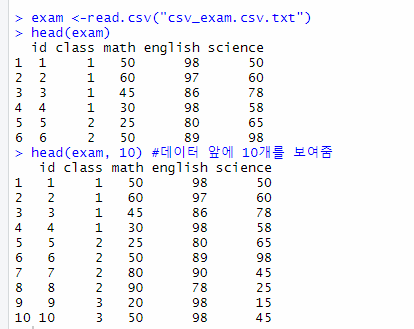 함수 기능 head( ) 데이터 앞부분 6개를 출력 tail( ) 데이터 뒷부분 6개를 출력 View( ) 뷰어 창에서 데이터 확인 dim( ) 데이터의 차원을 출력 str( ) 데이터의 속성을 출력 summary( ) 요약통계량을 출력 #데이터 준비 exam <- read.scv("csv_exam.csv") head(exam) head(exam, 10)